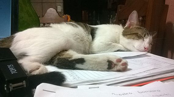 8 meses de edad. Es blanco, con el lomo, cuello y orejas de color pardo (café y rayas negras). Ojos de color verde claro. Pesa como unos 3 Kg. Es muy docil.