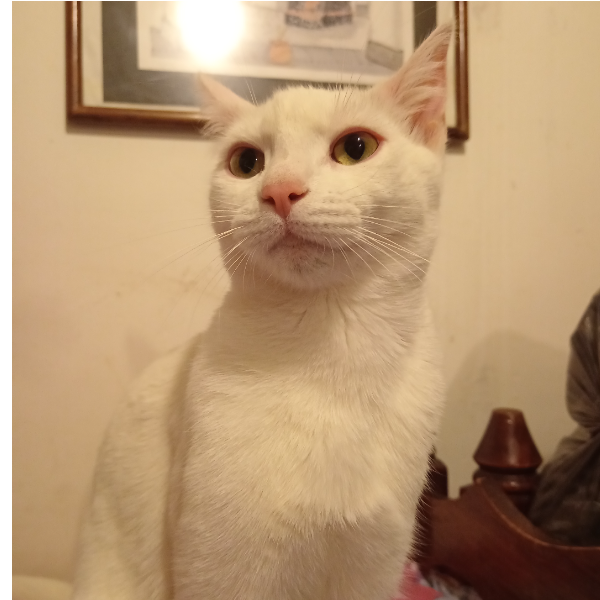 Se llama Michi, es blanca, esterilizada, tiene dos mechones pequeños de pelos grises en la cabeza como lunares, tamaño mediano, ojos verdes, es educada y cariñosa, edad 1 año 4 meses.