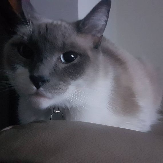 Blanca con gris, mayormente blanca con la cara, espalda y orejas grises, cola gris oscuro. Ojos azules, tiene placa pero el número que está ahí no esta actualizado.