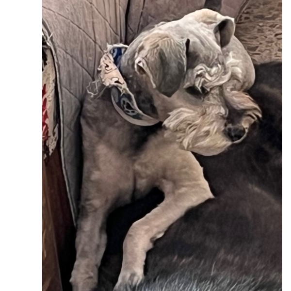 Tamaño pequeño, color gris, trae collar color azul agua con naranja, es criollo cruza de poodle y schnauzer, es muy nervioso, su nombre es Remy, no sabe andar en las calles solo porque nunca sale sin correa.