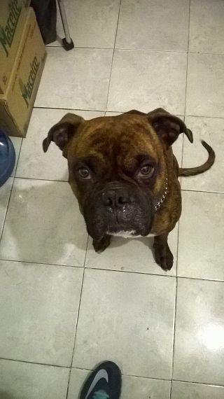 Boxer macho atigrado cafe, con canas en la cara, edad 8 años, se perdio el 18 de diciembre en la noche, muuy docil, no trae collar y no tiene la cola cortada, responde al nombre de rocco,