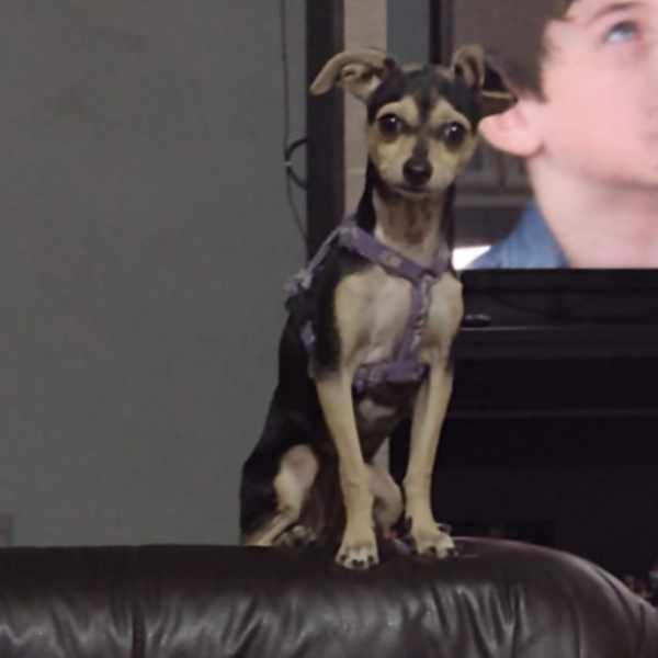 Traía un collar de listón rojo Es color negro con café claro en la parte del abdomen Y tiene sus orejas caídas (normalmente)