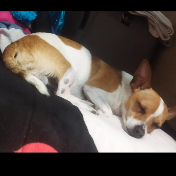 Chihuahua blanco con manchas cafés, es pequeño, responde a nombre de cuyo, es muy amigable,
