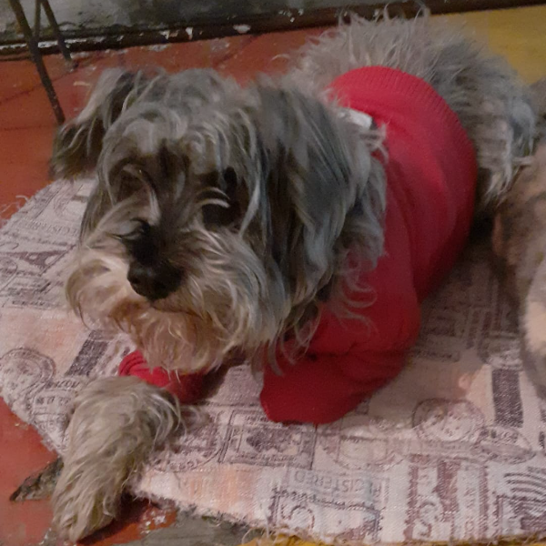 Trae puesto un chaleco rosa con bolitas de colores, su piel de muslos presenta resequedad por la edad, es una perrita viejita, tiene las pestañas muy largas. Es muy temerosa.