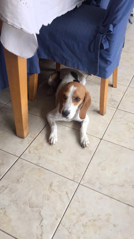 Beagle Hambra tricolor, muy nerviosa y cariñosa. Tiene manchas café y negras. No lleva collar.